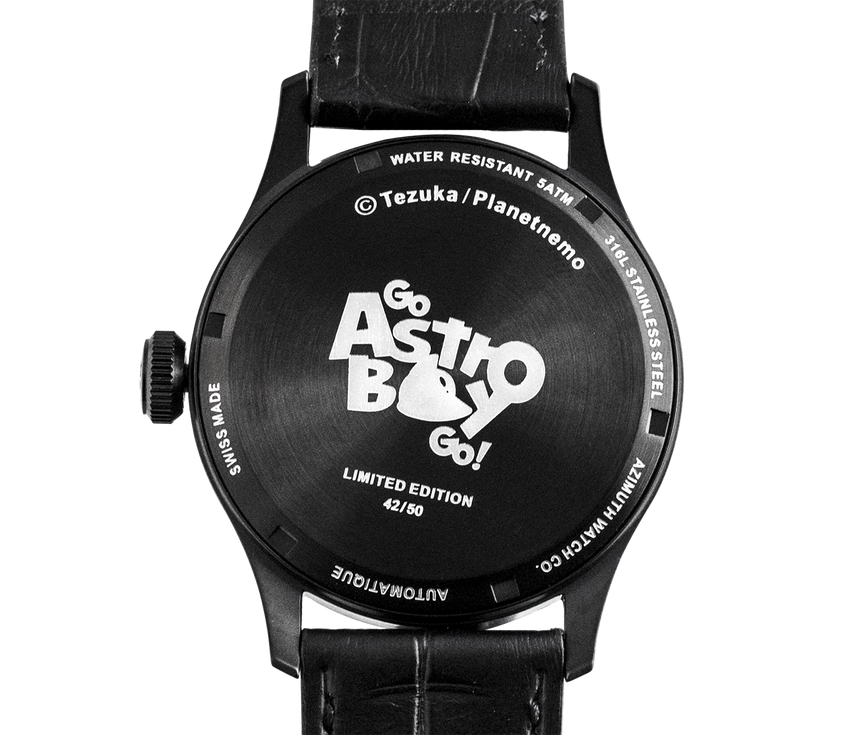 Azimuth collaborated with Tezuka/Planetnemo to create an automatic timepiece which tells time by the moving arms of Go Astro Boy Go! The playful nature of Go Astro boy Go! is best captured by the artist’s impression of him standing sideways and wearing a cheeky smile. At all angles he displays fluidity and life at every time-telling position.